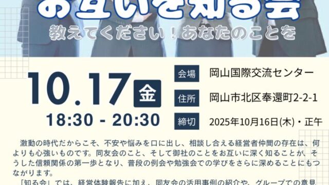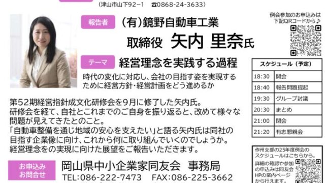 ホーム 2024年8月27日2025年10月9日 中小企業家同友会とは? こんな活動を行っています 企業変革支援プログラム 新着情報 すべて行事案内活動レポート会員企業紹介 これから始める経営理念の実践 (作州支部10月例会) 2025年10月3日 お互いを知る会~教えてください!あなたのことを (岡山北支部10月例会) 2025年10月3日 仲間と共感し合いながら学び続ける、私の自己変革 (女性部8月例会) 2025年9月24日 25年度岡山大学提供講座 「現代中小企業論」&意見交換会 2025年9月24日 岡山市との意見交換会 2025年9月24日 自社の存在意義や進むべき方向性を明確に (第52期経営指針成文化研修会) 2025年9月24日 これから始める経営理念の実践 (作州支部10月例会) 2025年10月3日 お互いを知る会~教えてください!あなたのことを (岡山北支部10月例会) 2025年10月3日 会社と地域の未来を 社員とともに考えられる会社づくり (作州支部9月例会) 2025年9月11日 ぶれない座標軸をもった経営へ (備北支部9月例会) 2025年9月9日 2025経営者フォーラム 2025年9月5日 2025年9月8日 逆境を乗り越え、未来へつなぐ経営 (岡山南支部9月例会) 2025年9月2日 仲間と共感し合いながら学び続ける、私の自己変革 (女性部8月例会) 2025年9月24日 25年度岡山大学提供講座 「現代中小企業論」&意見交換会 2025年9月24日 岡山市との意見交換会 2025年9月24日 自社の存在意義や進むべき方向性を明確に (第52期経営指針成文化研修会) 2025年9月24日 分析と行動で、明日を変えていく (岡山北支部8月例会) 2025年9月2日 私たちは不確かな未来にどう向き合うか (岡山南支部8月例会) 2025年9月1日 あなたの知らないわが社のヒミツ・その9-就労継続支援B型事業所カモノハシ(株式会社FIL DESIGN) 2025年8月20日 第37回「魅力発信!-New Face」STORY 2025年7月23日 第36回「魅力発信!-New Face」(株)空庵 2025年6月23日 2025年7月1日 第35回「魅力発信!-New Face」(株)ブロス 2025年4月28日 第34回「魅力発信!-New Face」(一社)Ai-care 2025年4月9日 あなたの知らないわが社のヒミツ・その8-(株)ユニコ 2025年4月9日 入会のご案内 行事案内 会員企業紹介 活動レポート 調査・提言 会報紙「COM」 役員名簿 公開行事予定 会員外の方もご参加いただけます。行事タイトルをクリックして表示されるページからお申込みください。 このエリアはインラインフレームを使用しています。