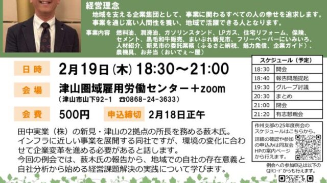 ホーム 2024年8月27日2026年1月29日 中小企業家同友会とは? こんな活動を行っています 企業変革支援プログラム 新着情報 すべて行事案内活動レポート会員企業紹介 当たり前を疑ったら世界が変わった! 協働で起こしたイノベーション (岡山南支部2月例会) 2026年2月10日 現場から経営へ 仲間とつくる未来へ (岡山北支部2月例会) 2026年2月6日 Check!! 我が社の「存在意義」 (作州支部2月例会) 2026年2月4日 「自社の存在価値とは何か」を考える(倉敷支部2月例会) 2026年2月2日 地域に根差し、地域と共に創る 奥野組の新たな価値 (東備×備北 合同2月例会) 2026年1月29日 女性部「経営の『理念』と『数字』を繋ぐ実践セミナー 2026年1月22日 当たり前を疑ったら世界が変わった! 協働で起こしたイノベーション (岡山南支部2月例会) 2026年2月10日 現場から経営へ 仲間とつくる未来へ (岡山北支部2月例会) 2026年2月6日 Check!! 我が社の「存在意義」 (作州支部2月例会) 2026年2月4日 「自社の存在価値とは何か」を考える(倉敷支部2月例会) 2026年2月2日 地域に根差し、地域と共に創る 奥野組の新たな価値 (東備×備北 合同2月例会) 2026年1月29日 <2/27開催>同友会オリエンテーション 2026年1月6日 2026年1月7日 女性部「経営の『理念』と『数字』を繋ぐ実践セミナー 2026年1月22日 同友会活動の意義と経営者の学び―そして次世代へのメッセージ 2026年1月22日 社員と共に挑む! 新しい市場を切り開く力(岡山南支部12月例会) 2026年1月20日 心理的安全性の高い職場環境を目指して (岡山北支部12月例会) 2026年1月15日 女子野球日本一を目指した組織づくり (東備支部12月例会) 2026年1月15日 強みの再発見から 始まる新市場開拓 (倉敷支部12月例会) 2026年1月15日 第41回「魅力発信!-New Face」(株)山根工務店 2026年1月22日 第40回「魅力発信!-New Face」KitoBito (キトビト) 2025年12月3日 第39回「魅力発信!-New Face」(株)長崎鐵工所 2025年11月18日 第38回「魅力発信!-New Face」パソコン駆け込み寺 岡山下中野教室 2025年10月17日 あなたの知らないわが社のヒミツ・その9-就労継続支援B型事業所カモノハシ(株式会社FIL DESIGN) 2025年8月20日 第37回「魅力発信!-New Face」STORY 2025年7月23日 入会のご案内 行事案内 会員企業紹介 活動レポート 調査・提言 会報紙「COM」 役員名簿 公開行事予定 会員外の方もご参加いただけます。行事タイトルをクリックして表示されるページからお申込みください。 このエリアはインラインフレームを使用しています。