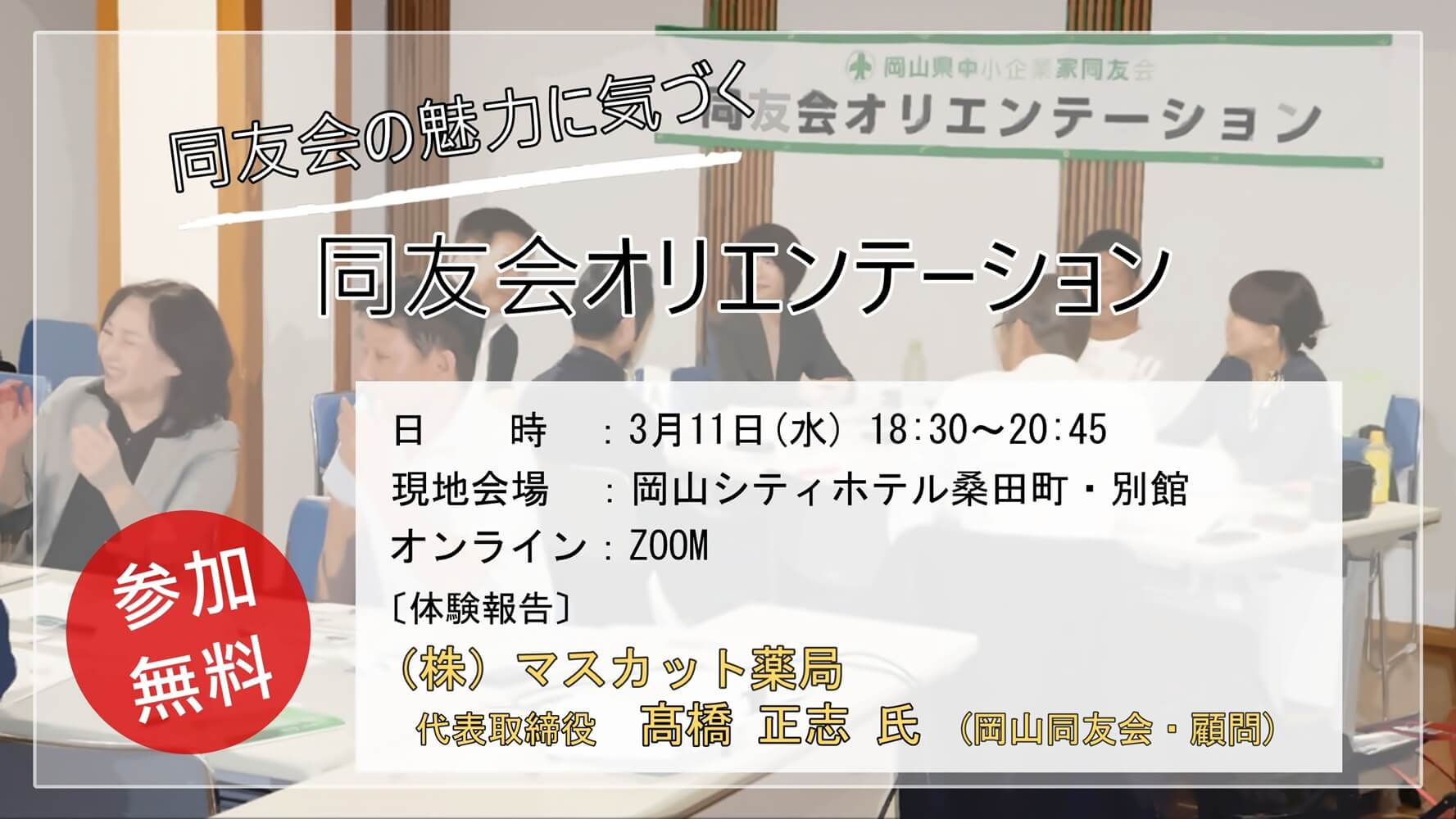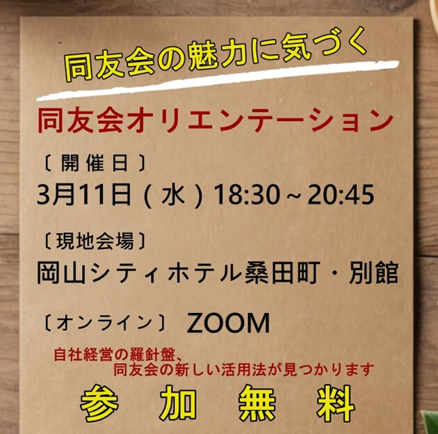 ホーム 2024年8月27日2026年3月2日 中小企業家同友会とは? こんな活動を行っています 企業変革支援プログラム 新着情報 すべて行事案内活動レポート会員企業紹介 経営の羅針盤と新たな活用法が見つかる―3/11開催・同友会オリエンテーション 2026年3月2日 付加価値を高める取引先との関係強化 (備北支部3月例会) 2026年2月27日 地域の困りごとから、事業は動き出した (岡山南・青年部合同例会) 2026年2月27日 好奇心が切り拓く次のステージ (岡山北支部3月例会) 2026年2月24日 2026年2月26日 付加価値を高める我が社の事業戦略 (作州・東備合同例会) 2026年2月20日 2026年2月27日 自社事業の付加価値を高めるとは? (倉敷支部3月例会) 2026年2月19日 2026年2月27日 経営の羅針盤と新たな活用法が見つかる―3/11開催・同友会オリエンテーション 2026年3月2日 付加価値を高める取引先との関係強化 (備北支部3月例会) 2026年2月27日 地域の困りごとから、事業は動き出した (岡山南・青年部合同例会) 2026年2月27日 好奇心が切り拓く次のステージ (岡山北支部3月例会) 2026年2月24日 2026年2月26日 付加価値を高める我が社の事業戦略 (作州・東備合同例会) 2026年2月20日 2026年2月27日 自社事業の付加価値を高めるとは? (倉敷支部3月例会) 2026年2月19日 2026年2月27日 人が育てば、会社は伸びる~肥沃な大地に果実は実る (2026新春経営講演) 2026年2月18日 会の理念と魅力を伝えるオリエンテーションを開催 2026年2月18日 女性部「経営の『理念』と『数字』を繋ぐ実践セミナー 2026年1月22日 同友会活動の意義と経営者の学び―そして次世代へのメッセージ 2026年1月22日 社員と共に挑む! 新しい市場を切り開く力(岡山南支部12月例会) 2026年1月20日 心理的安全性の高い職場環境を目指して (岡山北支部12月例会) 2026年1月15日 第42回「魅力発信!-New Face」(一社)ファーストペンギン 2026年2月18日 第41回「魅力発信!-New Face」(株)山根工務店 2026年1月22日 第40回「魅力発信!-New Face」KitoBito (キトビト) 2025年12月3日 第39回「魅力発信!-New Face」(株)長崎鐵工所 2025年11月18日 第38回「魅力発信!-New Face」パソコン駆け込み寺 岡山下中野教室 2025年10月17日 あなたの知らないわが社のヒミツ・その9-就労継続支援B型事業所カモノハシ(株式会社FIL DESIGN) 2025年8月20日 入会のご案内 行事案内 会員企業紹介 活動レポート 調査・提言 会報紙「COM」 役員名簿 公開行事予定 会員外の方もご参加いただけます。行事タイトルをクリックして表示されるページからお申込みください。 このエリアはインラインフレームを使用しています。