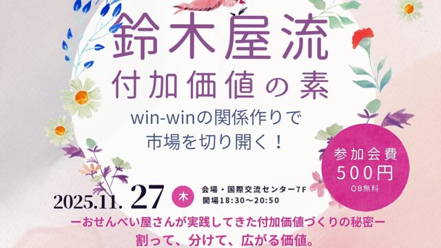 ■会員以外の経営者・後継者・取締役以上の幹部の方、行政・経営支援機関・金融機関の方もご参加いただけます(会員企業以外の一般社員の方のご参加はご遠慮願います)。